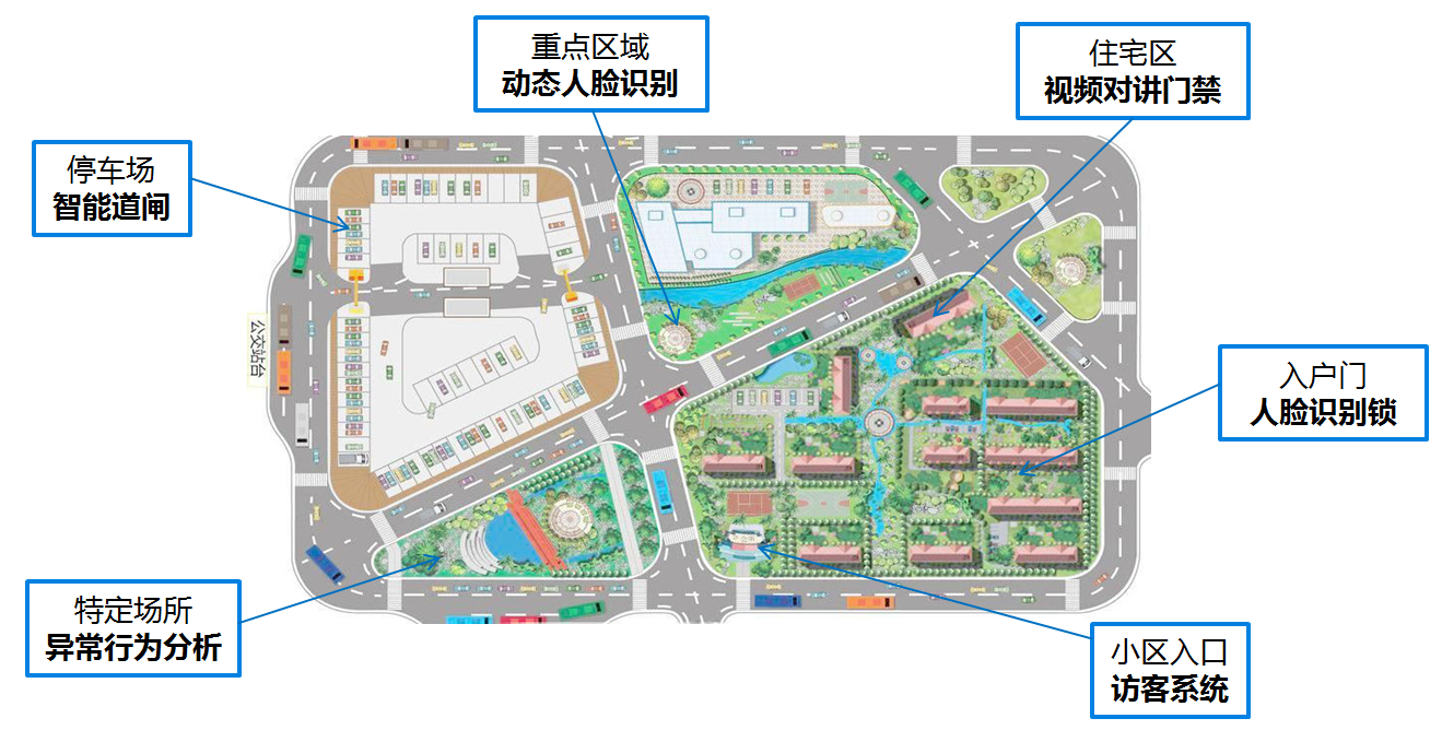 打造社区智能停车场、重点区域的动态识别系统、社区入户人脸识别门锁系统、社区入口访客系统、特定场所的异常行为分析系统。